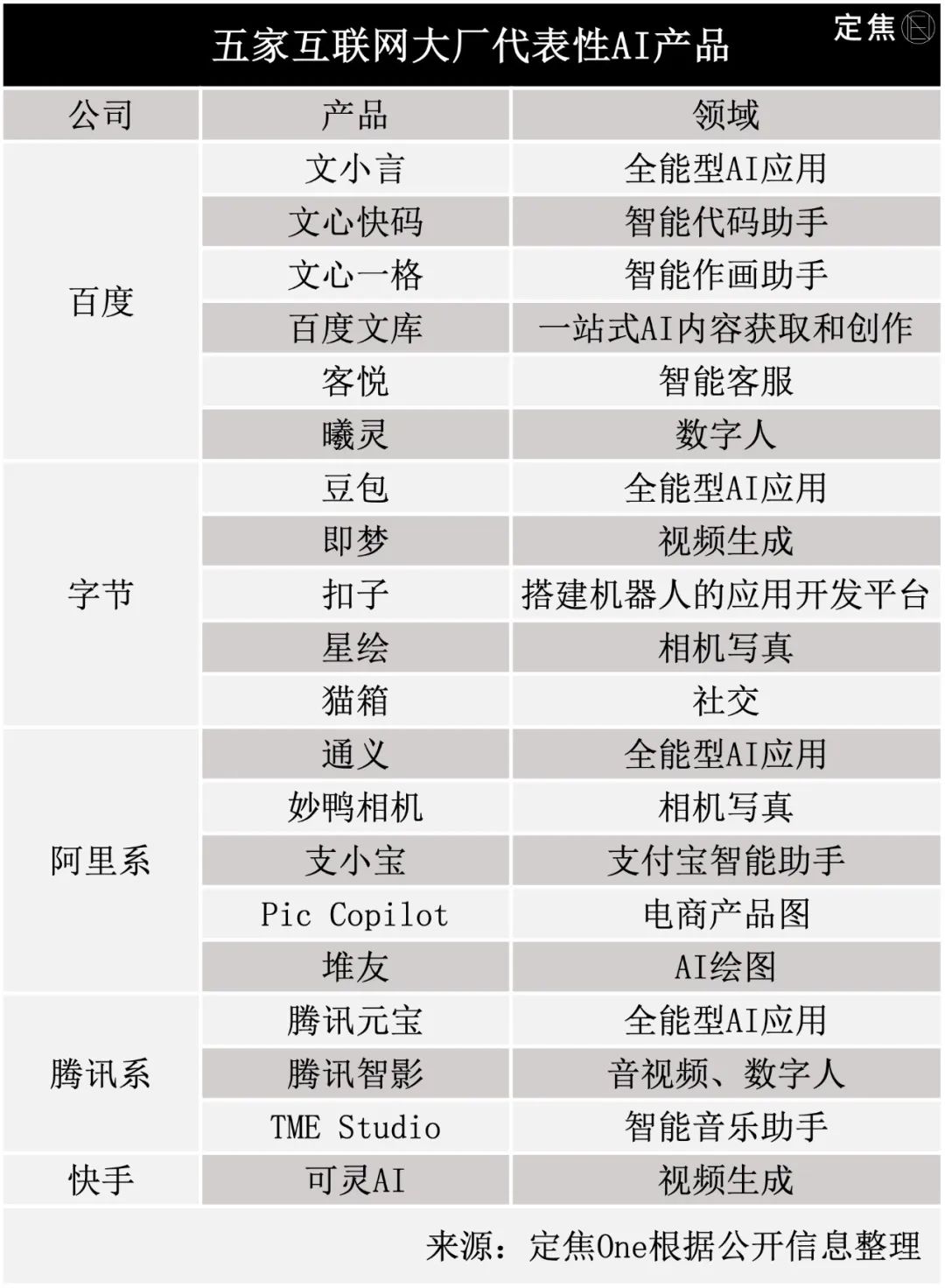 根據公開信息,「定焦One」梳理出了近兩年來,五家大廠各自具備代表性的toB、toC類AI應用產品。