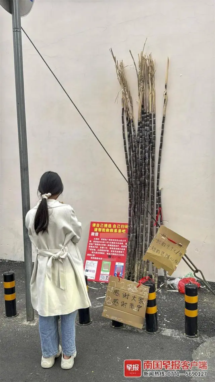 如今,全家都在為救治黃開佑而奔忙。黃德芬19歲的妹妹把自己打工攢下的幾千元錢轉了過來,弟弟所在中學的領導和教師們開展募捐活動,鄉親們也紛紛慷慨解囊。目前,黃家共收到各方捐款8萬余元。黃德芬也打算一邊照顧弟弟,一邊擺攤賺點小錢給弟弟治病。想到家鄉盛產黑皮甘蔗,甘蔗可以豎著靠墻放,不占地方,她決定擺攤賣甘蔗。11月7日,父親從欽州送來一批甘蔗,因為要陪護弟弟不能時刻守攤,她就擺上收款碼,由顧客自取甘蔗自行付款。