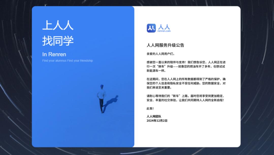 面對網(wǎng)絡上不斷發(fā)酵的停服傳言,人人網(wǎng)團隊當晚在官網(wǎng)發(fā)布了一則公告進行回應。人人網(wǎng)在公告中稱,其正在進行一次“換車”升級。為了方便外界理解,人人網(wǎng)還打了個比方:“就像您的燃油車開了多年,也想試試新能源車一樣。”