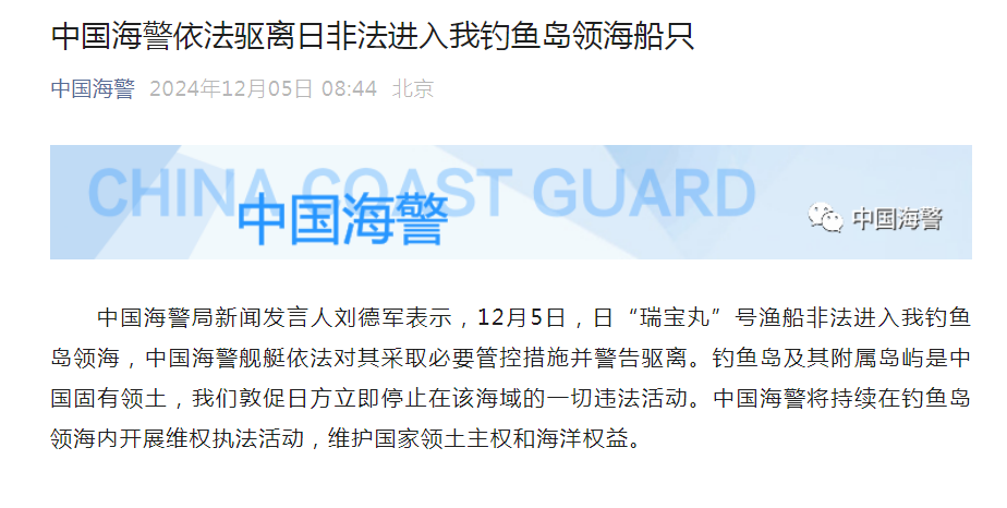 中國海警局新聞發言人劉德軍表示,12月5日,日“瑞寶丸”號漁船非法進入我釣魚島領海,中國海警艦艇依法對其采取必要管控措施并警告驅離。釣魚島及其附屬島嶼是中國固有領土,我們敦促日方立即停止在該海域的一切違法活動。中國海警將持續在釣魚島領海內開展維權執法活動,維護國家領土主權和海洋權益。