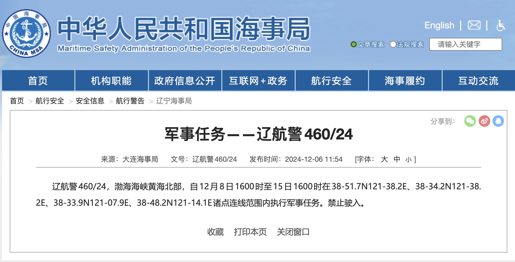 渤海海峽黃海北部將有軍事任務(wù),這一區(qū)域禁止駛?cè)?/h3>