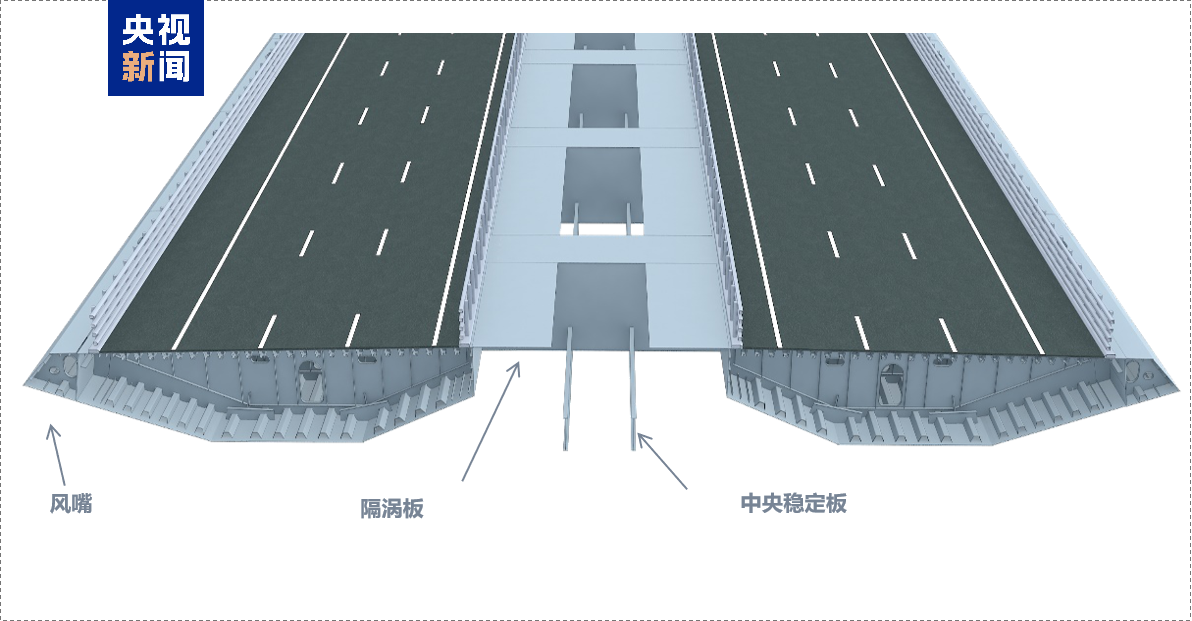 項目完成了近150種主梁斷面的氣動選型,首次提出了“風嘴+水平隔渦板+下中央穩定板”綜合氣動措施,并首次開展全橋渦振風洞試驗進行驗證,沒有觀測到渦振現象,結果優于世界最嚴渦振評價指標要求。