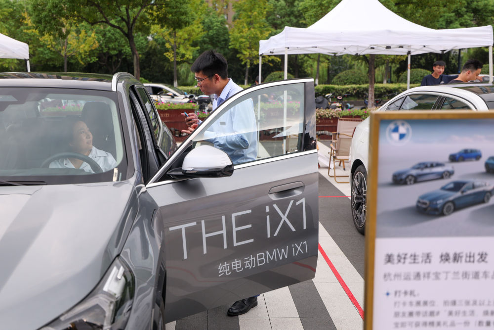 9月27日,經銷商(右)在“美好生活 煥新出發”消費品以舊換新展會現場向消費者介紹車輛。(新華社記者 江漢 攝)