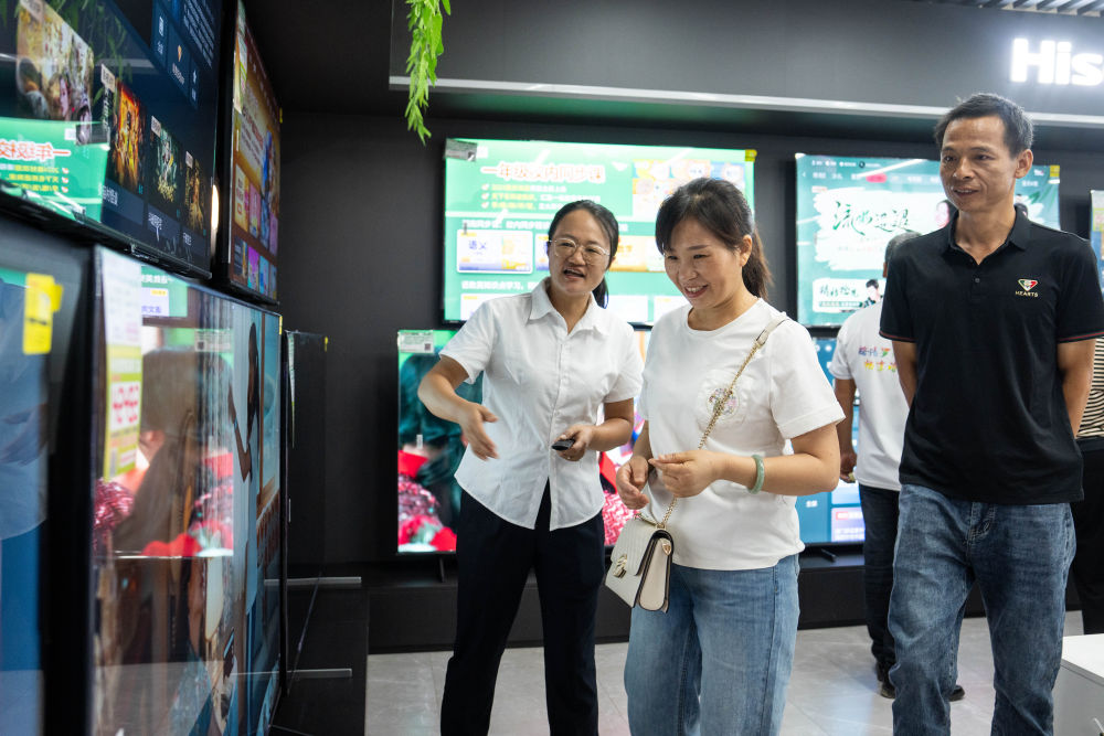 9月24日,彭坤(右一)和妻子彭建華(中)在汨羅市天虹電器城挑選電視。在湖南省岳陽市汨羅市屈子祠鎮雙楚村,彭坤、彭建華夫婦家中有一臺使用了近十年的32英寸液晶電視機。今年,在以舊換新政策的吸引下,他們決定更換一臺更大更好的電視機。根據實際需求和個人喜好,在反復對比后,他們換購了一臺75英寸的新款液晶電視機。舊電視在新機送貨上門時被當場回收,疊加各種補貼后,實際成交價較廠商定價優惠了近30%。(新華社記者 陳思汗 攝)