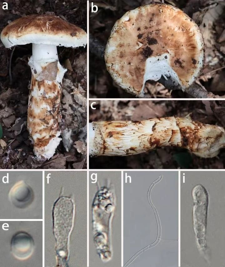 假松口蘑形態特征圖(a:擔子果;b:菌蓋;c:菌柄;d-e:擔孢子;f-g:擔子;h:菌蓋表皮菌絲;i:褶緣囊狀體)
