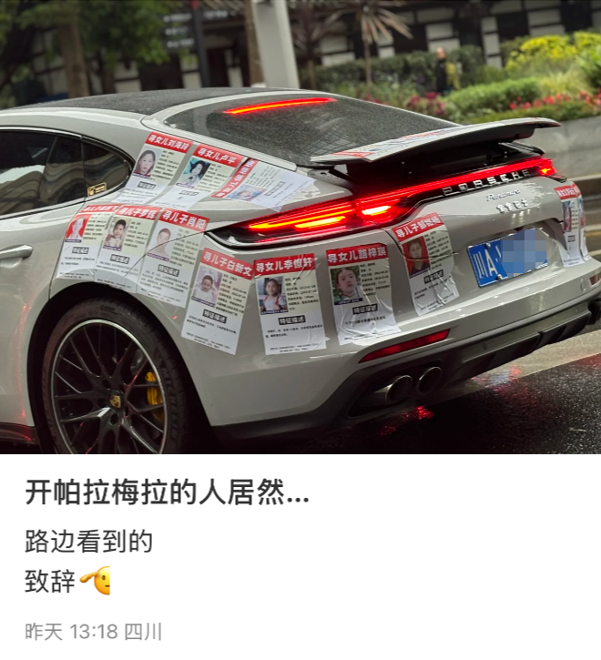 12月10日,四川成都一輛保時捷帕拉梅拉私家車車尾貼滿尋人啟事的照片被網友發到網上,并配文“路邊看到的,致敬”。該帖子迅速引發熱議,網友紛紛點贊,但也有人質疑這是“百萬豪車行善作秀”。