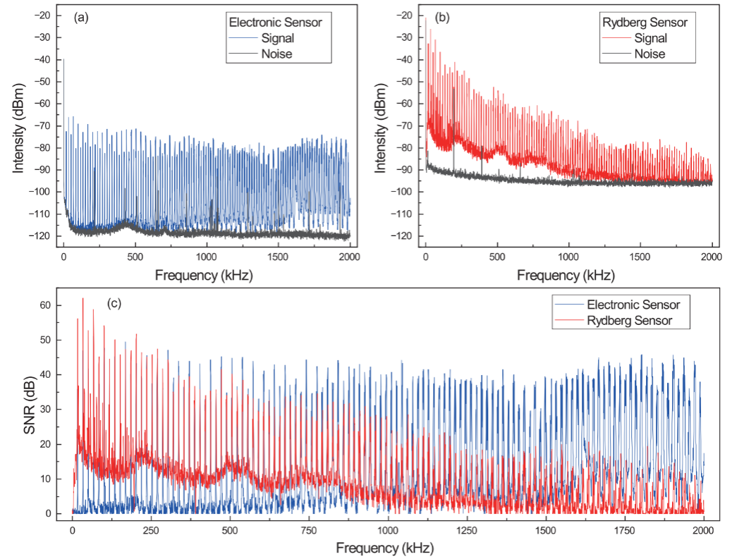 圖2:頻域對比圖。(a)使用金屬天線測量得到的電弧射頻信號。(b)使用里德堡原子天線測量得到的電弧射頻信號。(c)兩種測量方法的頻域信噪比對比。