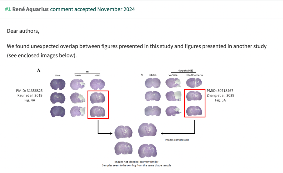 2024年3月,在一篇關于蛛網膜下腔出血論文的評論區,Aquarius標注了熒光圖像的復制粘貼問題。3個月后,他收到了期刊的回復:“作者對圖中存在的某些瑕疵表示遺憾,這些錯誤發生在圖像的繪制過程中,有必要進行更正,但不會影響研究結果或結論。”