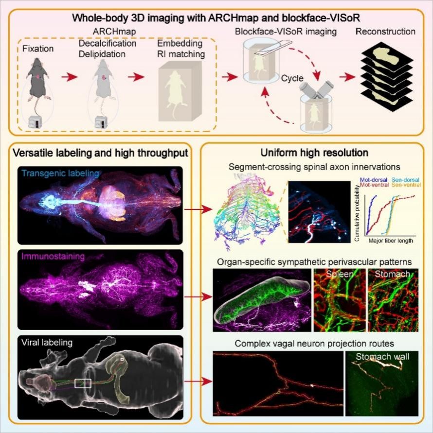 中國科學技術大學合肥微尺度物質科學國家研究中心和生命科學與醫學部畢國強、劉北明教授聯合合肥綜合性國家科學中心人工智能研究院、中國科學院深圳先進技術研究院團隊,在大尺度生物組織三維顯微成像領域取得重大突破,成功開發世界最快的小動物全身亞細胞級高清三維成像技術,實現周圍神經系統精細地圖的高效繪制。相關成果以“High-speed mapping of whole-mouse peripheral nerves at subcellular resolution”為題于北京時間7月10日發表在《細胞》(Cell)上。