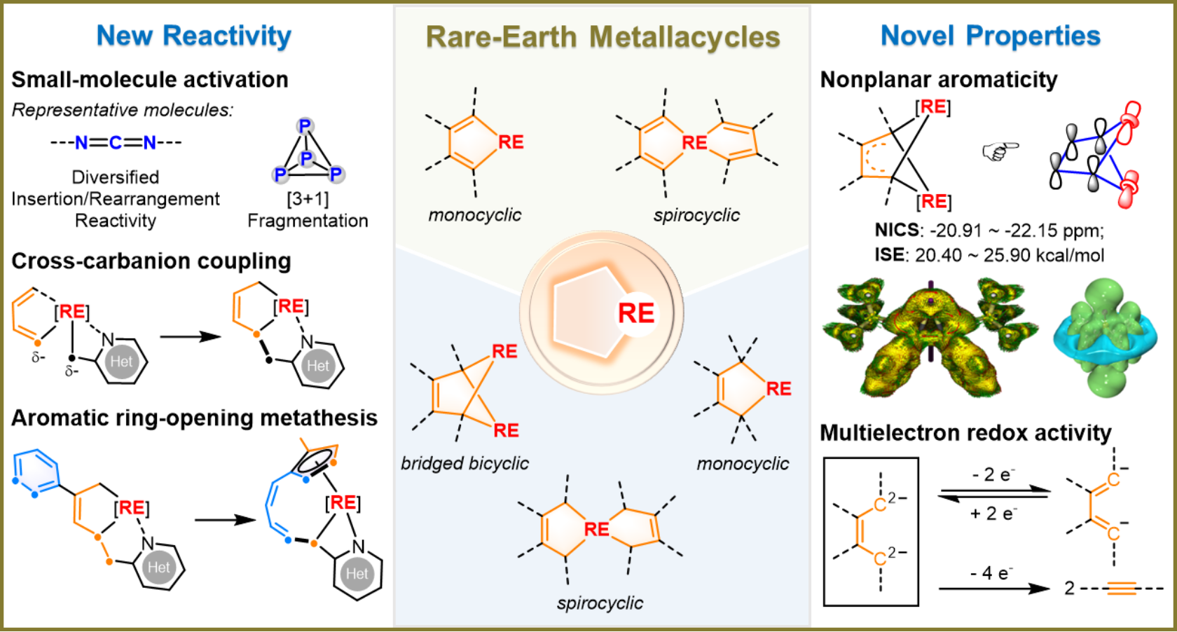 自1998年起,北京大學(xué)化學(xué)與分子工程學(xué)院席振峰教授持續(xù)開(kāi)展多取代1,4-二鋰-1,3-丁二烯(又名雙鋰試劑)的合成及反應(yīng)化學(xué)研究。當(dāng)張文雄博士于2007年加入席振峰團(tuán)隊(duì)后,率先啟動(dòng)了雙鋰試劑與稀土鹵化物的轉(zhuǎn)金屬化反應(yīng),嘗試合成雙稀土金屬有機(jī)試劑。經(jīng)過(guò)六年不斷探索,研究團(tuán)隊(duì)于2013年意外獲得了第一個(gè)雙茂稀土金屬雜環(huán)戊二烯,再經(jīng)過(guò)兩年的努力,發(fā)表了有關(guān)稀土金屬雜環(huán)戊二烯的第一篇論文(Ling Xu, Yu-Chen Wang, Junnian Wei, Yang Wang, Zitao Wang, Wen-Xiong Zhang*, and Zhenfeng Xi, The First Lutetacyclopentadienes: Synthesis, Structure, and Diversified Insertion/C?H Activation Reactivity, Chem. Eur. J . 2015, 21 , 6686)。此后,張文雄博士開(kāi)啟了稀土金屬有機(jī)雜環(huán)化學(xué)之旅,在稀土金屬有機(jī)雜環(huán)的合成、結(jié)構(gòu)表征、反應(yīng)性及合成應(yīng)用等方面取得了一系列開(kāi)拓性研究成果(圖1,Chem. Sci . 2017, 8 , 6852; Angew. Chem. Int. Ed. 2017, 56 , 15886; J. Am. Chem. Soc. 2019, 141 , 6843; J. Am. Chem. Soc . 2019, 141 , 20547; J. Am. Chem. Soc . 2020, 142 , 10705; J. Am. Chem. Soc . 2021, 143 , 9151; Cell Rep. Phys. Sci . 2022, 3 , 100831; J. Am. Chem. Soc . 2023, 145 , 6633; Cell Rep. Phys. Sci . 2023, 4 , 101479; J. Am. Chem. Soc . 2024, 146 , 15609; J. Am. Chem. Soc . 2025,147 , 1300.)。近日,他們應(yīng)邀在Accounts of Chemical Research雜志上發(fā)表了題為“The Enchanting Realm of Five-Membered Rare-Earth Metallacycles”的綜述文章(Acc. Chem. Res . 2025, 58 , 1696—1709)。該論文系統(tǒng)總結(jié)了團(tuán)隊(duì)十余年來(lái)在相關(guān)研究領(lǐng)域的深入探索與積累:針對(duì)稀土金屬雜環(huán)的合成難題,發(fā)展了直接轉(zhuǎn)金屬化和轉(zhuǎn)金屬化–還原等簡(jiǎn)單易行的合成策略,首次實(shí)現(xiàn)了包括稀土金屬雜環(huán)戊二烯、稀土金屬螺雜環(huán)戊二烯、稀土金屬螺雜環(huán)戊烯、橋聯(lián)雙稀土金屬雜環(huán)戊烯在內(nèi)的一系列稀土金屬有機(jī)雜環(huán)分子的合成、分離與表征;深入探討了稀土金屬雜環(huán)在小分子活化、碳–碳鍵構(gòu)建及惰性化學(xué)鍵活化等轉(zhuǎn)化中的高反應(yīng)活性,揭示了其區(qū)別于主族和過(guò)渡金屬的獨(dú)特反應(yīng)機(jī)制,表明通過(guò)合理設(shè)計(jì),稀土金屬不僅能夠模擬過(guò)渡金屬的典型反應(yīng)特性,甚至在某些體系中展現(xiàn)出超越后者的獨(dú)特反應(yīng)能力,為其在合成化學(xué)中的應(yīng)用拓展提供了切實(shí)可行的研究基礎(chǔ);并介紹了稀土金屬雜環(huán)所展現(xiàn)的獨(dú)特性質(zhì),首次將非平面芳香性引入稀土金屬有機(jī)化學(xué)體系,基于配體的氧化還原性質(zhì)實(shí)現(xiàn)了稀土金屬雜環(huán)體系的多電子轉(zhuǎn)移行為,拓展了稀土金屬有機(jī)化學(xué)的研究邊界。該論文被選為封面文章發(fā)表(圖2)。