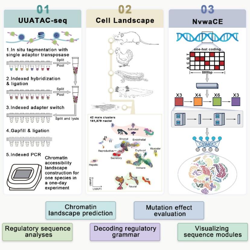 通過學習UUATAC-seq技術獲得的大量高質量數據,“女媧”讀懂了脊椎動物的調控序列編碼規則,能夠基于一維DNA序列,預測其在任意脊椎動物單細胞中的染色質可及性水平。
