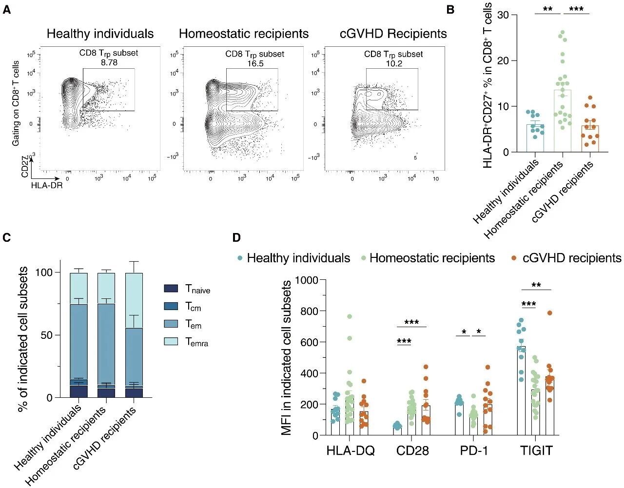 健康個(gè)體、異基因造血干細(xì)胞移植后穩(wěn)態(tài)恢復(fù)受者及慢性移植物抗宿主病受者中CD8 Trp細(xì)胞的比例與特征