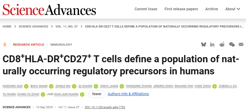 近日,國(guó)際學(xué)術(shù)期刊Science Advances刊發(fā)北京大學(xué)人民醫(yī)院的研究成果。該研究首次在健康人體內(nèi)鑒定出一類具有天然免疫調(diào)節(jié)功能的CD8+T細(xì)胞亞群(CD8Trp),揭示了免疫系統(tǒng)調(diào)控的新機(jī)制,為異基因造血干細(xì)胞移植后移植物抗宿主病(GVHD)防治、自身免疫性疾病干預(yù)及腫瘤免疫治療提供了新靶點(diǎn)。北京大學(xué)人民醫(yī)院血液科副研究員郭惠東,博士生王碧霞、吳志桂為本文共同第一作者。北京大學(xué)血液病研究所所長(zhǎng),國(guó)家血液系統(tǒng)疾病臨床醫(yī)學(xué)研究中心主任,北京大學(xué)人民醫(yī)院血液科主任黃曉軍院士,北京大學(xué)人民醫(yī)院副院長(zhǎng)趙翔宇教授為本文通訊作者。