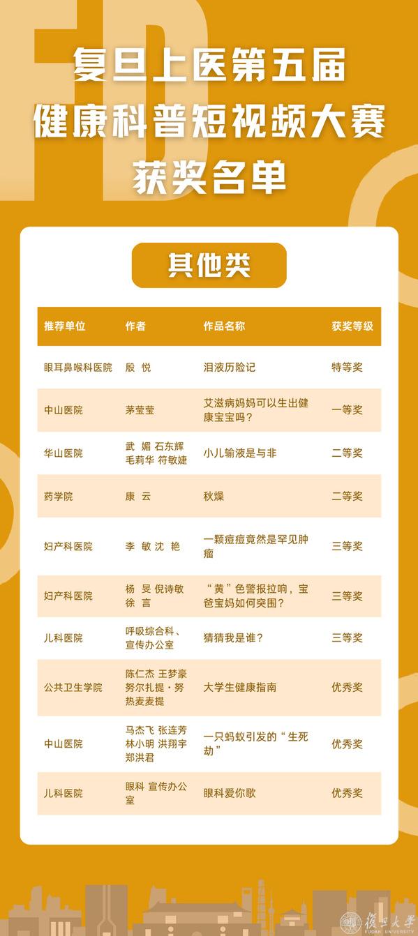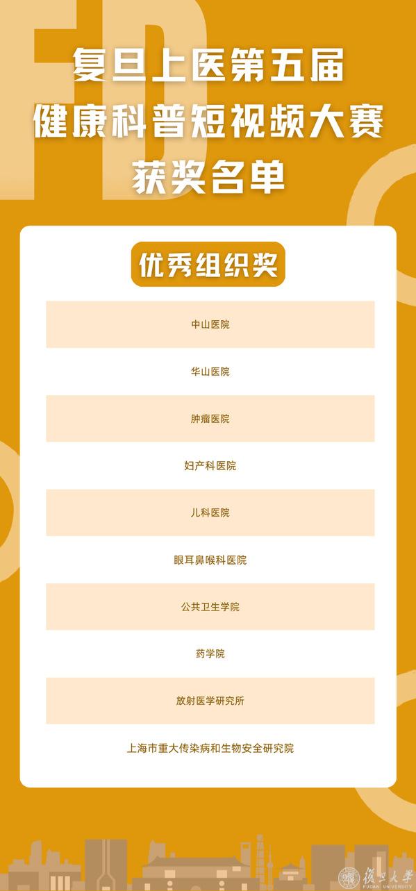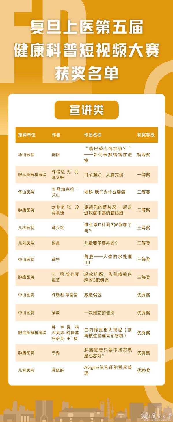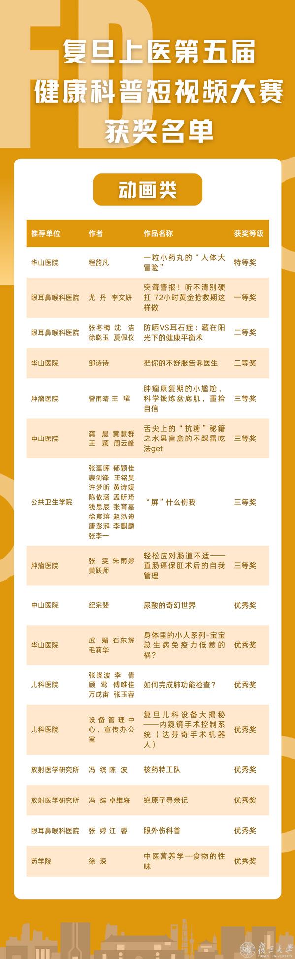 期待更多的醫務工作者、科研工作者加入健康科普的事業中來,讓高深的醫學知識飛入尋常百姓家,秉承“為人群服務”的精神,成為科普知識的傳播者、健康教育的領軍者。后續我們將在復旦上醫官微和視頻號陸續推出本次獲獎的其他作品,敬請期待!