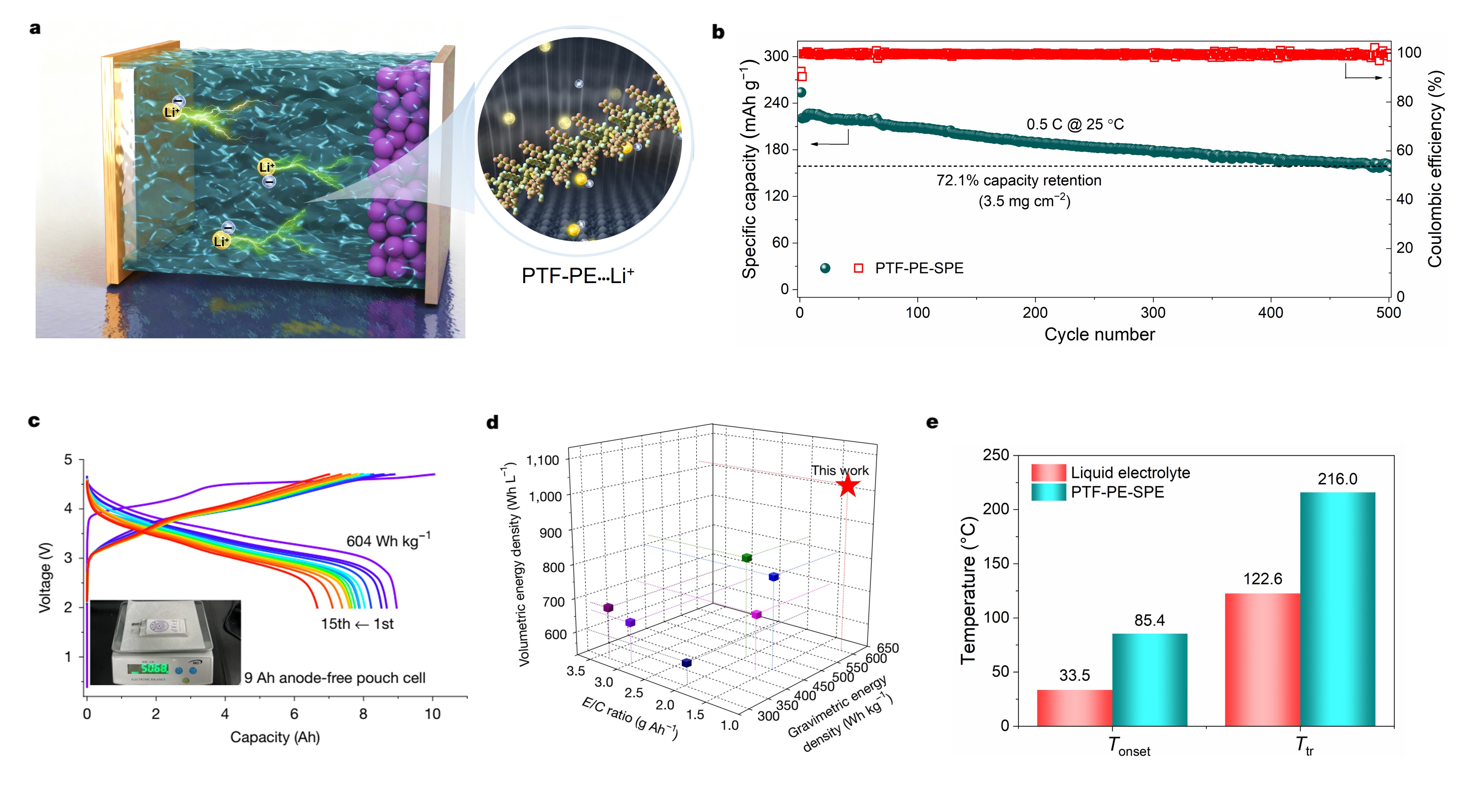 圖2.基于含氟聚醚電解質(zhì)的全電池(a)綜合性能卓越:0.5C循環(huán)500次容量保持率72.1%(b);8.96 Ah軟包電池能量密度達604 Wh kg?1(c),且顯著優(yōu)于其他體系(d)。電池安全性尤為突出,熱失控起始溫度高,順利通過針刺與熱箱測試