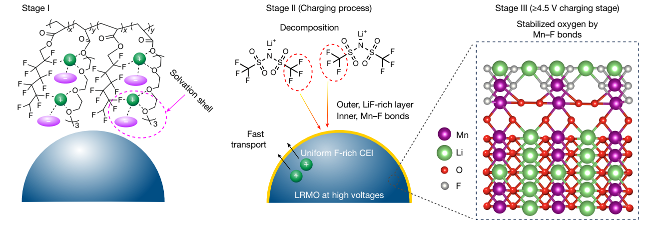 近期,清華大學(xué)化工系張強教授團隊提出“富陰離子溶劑化結(jié)構(gòu)”設(shè)計新策略,成功開發(fā)出一種新型含氟聚醚電解質(zhì)。該電解質(zhì)通過熱引發(fā)原位聚合技術(shù),有效增強了固態(tài)界面的物理接觸與離子傳導(dǎo)能力。研究團隊在聚醚電解質(zhì)中引入強吸電子含氟基團,顯著提升了其耐高壓性能,使其可匹配4.7V高電壓富鋰錳基正極,實現(xiàn)了單一電解質(zhì)對高電壓正極與金屬鋰負極的同步兼容。基于鋰鍵化學(xué)原理,團隊構(gòu)建了獨特的“–F???Li????O–”配位結(jié)構(gòu),誘導(dǎo)形成具有高離子電導(dǎo)率的富陰離子溶劑化結(jié)構(gòu),進而在電極表面衍生出富含氟化物的穩(wěn)定界面層,顯著提升了界面穩(wěn)定性。