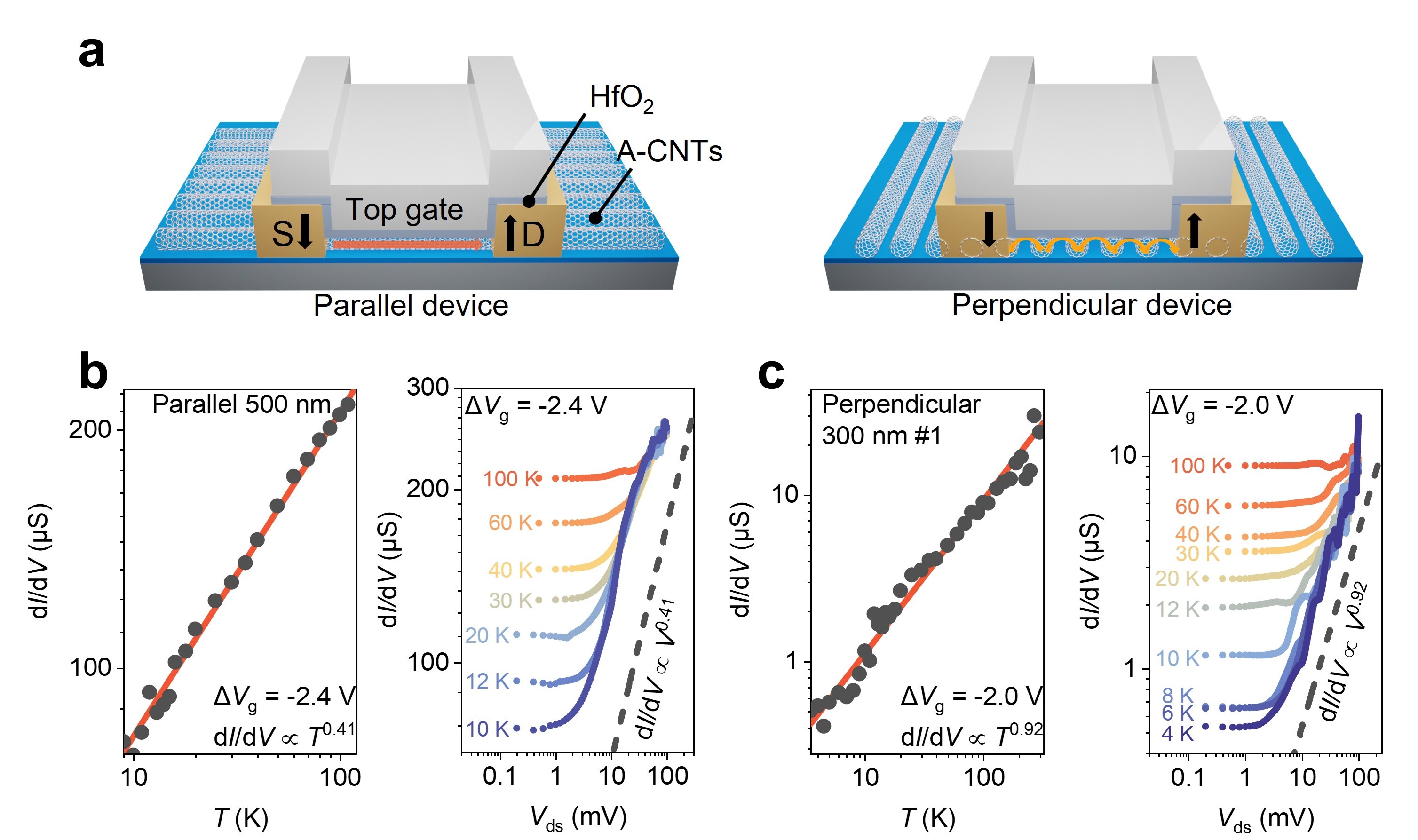 圖2. 高密度碳納米管陣列的Luttinger liquid行為。(a)基于碳納米管陣列的平行與垂直器件結構示意圖;平行(b)和垂直(c)器件的微分電導隨溫度和偏壓的冪律標度行為