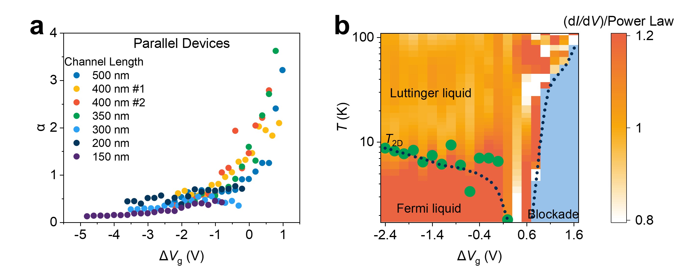 進一步的研究表明,通過調節柵極電壓,多個器件中均觀察到一致的Luttinger liquid冪律指數規律:隨載流子濃度增加,電子-電子相互作用因管間介電屏蔽效應而減弱,清晰地驗證了可調控的電子關聯效應(圖3a)。在高載流子濃度區間,隨著溫度的進一步降低,管間耦合效應開始影響電子特性,體系從Luttinger liquid行為過渡到Fermi liquid行為;而在低載流子濃度區間,電子局域化效應明顯,體系表現為熱激發的庫倫阻塞特征(圖3b)。通過對輸運行為的系統分析,團隊成功構建了耦合一維電子體系的完整實驗相圖,揭示了電子關聯效應在維度調控下的系統性轉變,為理解低維體系中的量子相行為提供了直接實驗證據。