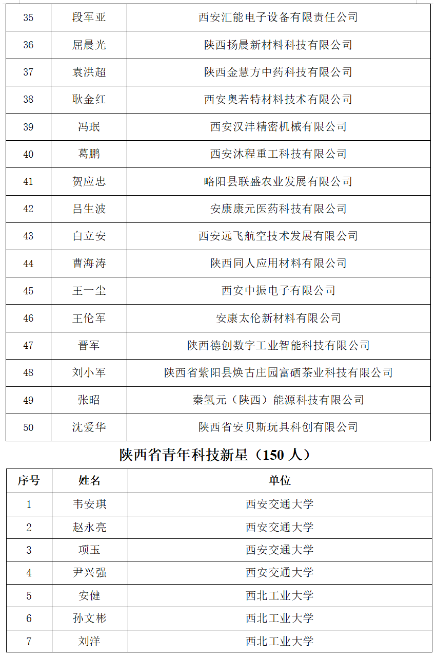 根據《陜西省科學技術廳關于組織推薦2025年中青年科技創新領軍人才、科技創新創業人才及2026年陜西省青年科技新星的通知》(陜科人才函〔2025〕194號),經個人申報、所在單位遴選、主管部門推薦、資格審查、專家評審、會議審定,擬確定西安交通大學杜少毅等100名同志入選2025年陜西省中青年科技創新領軍人才、西安航天發動機有限公司同立軍等50名同志入選2025年陜西省科技創新創業人才、西安交通大學韋安琪等150名同志入選2026年陜西省青年科技新星。
